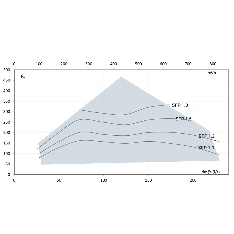 - Specifinis energijos suvartojimas (SPI) 0.159 W/(m³/h)