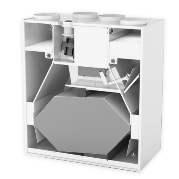 Vėdinimo įrenginys Vallox 51 CFi (dešininis/kairinis) su priešpriešinių srautų entalpiniu šilumokaičiu ir integruotu elektriniu šildytuvu (900W).